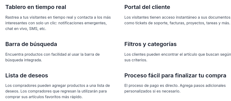 Fortalece la relación con tus clientes: tener tu tienda en línea no significa que no puedas acercarte a ellos. Habla con tus clientes en tiempo real, ayúdalos a encontrar el producto perfecto y comparte tus reseñas para ganar su confianza.
